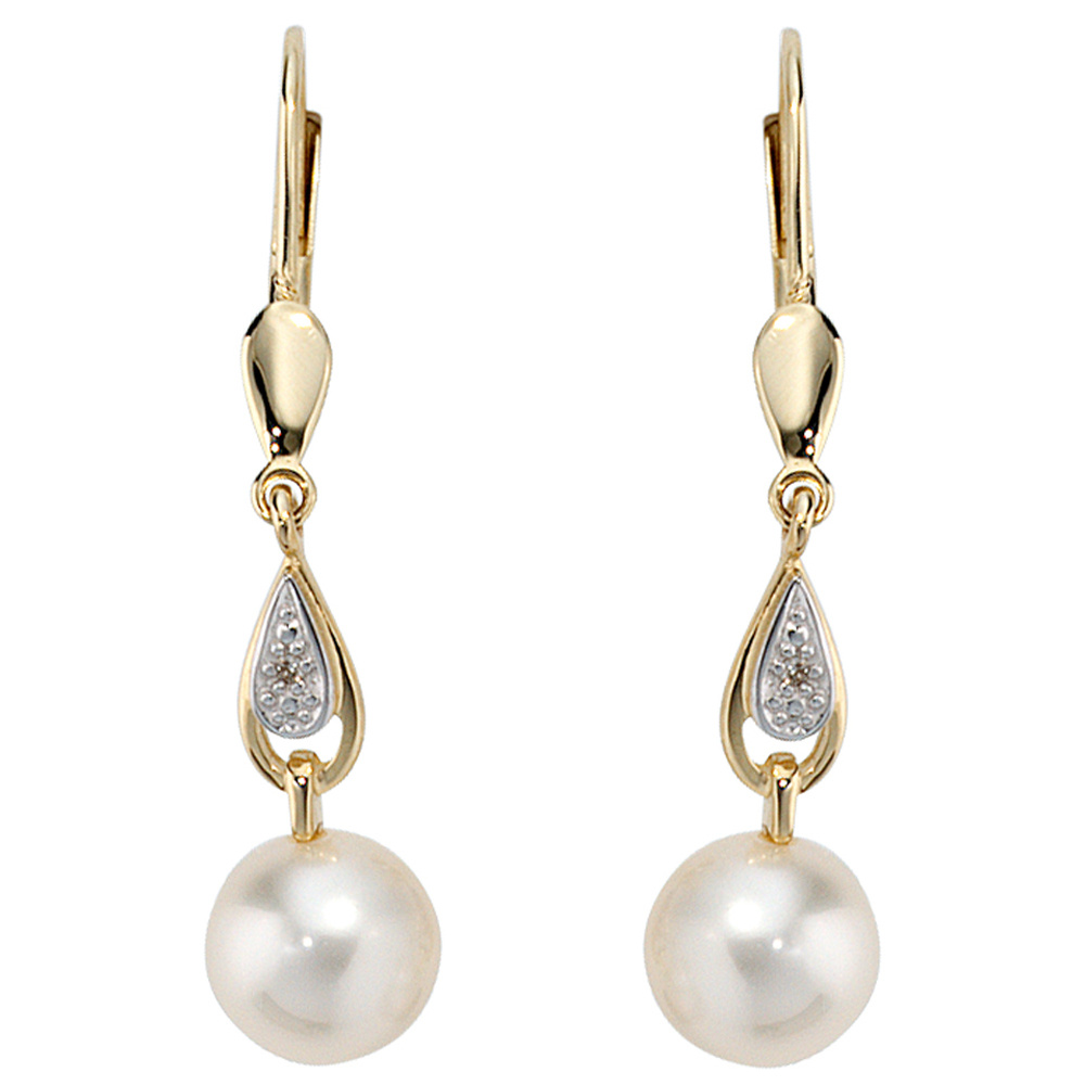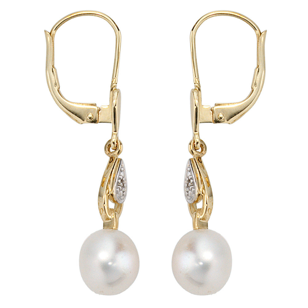 mit 2 Süßwasser-Zuchtperlen und 2 Diamant-Brillanten, 0,01 ct.,