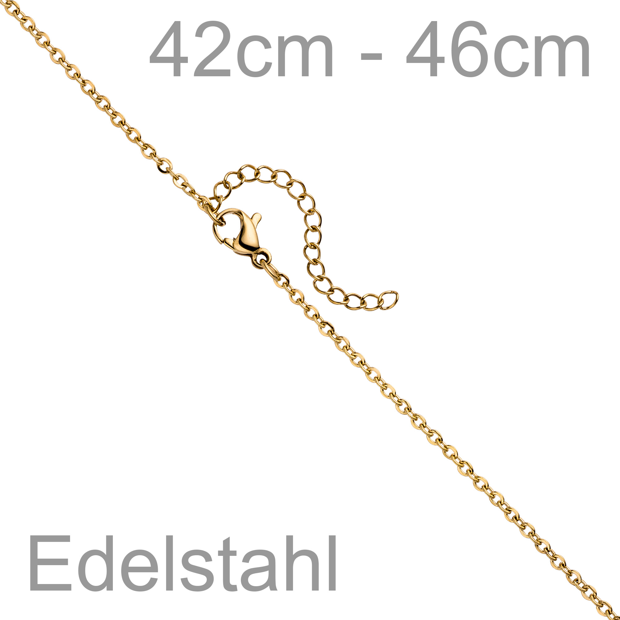 Länge ca. 46 cm, auf 42 cm verkürzbar, Kettenstärke ca. 1,9 mm x 1,9 mm,