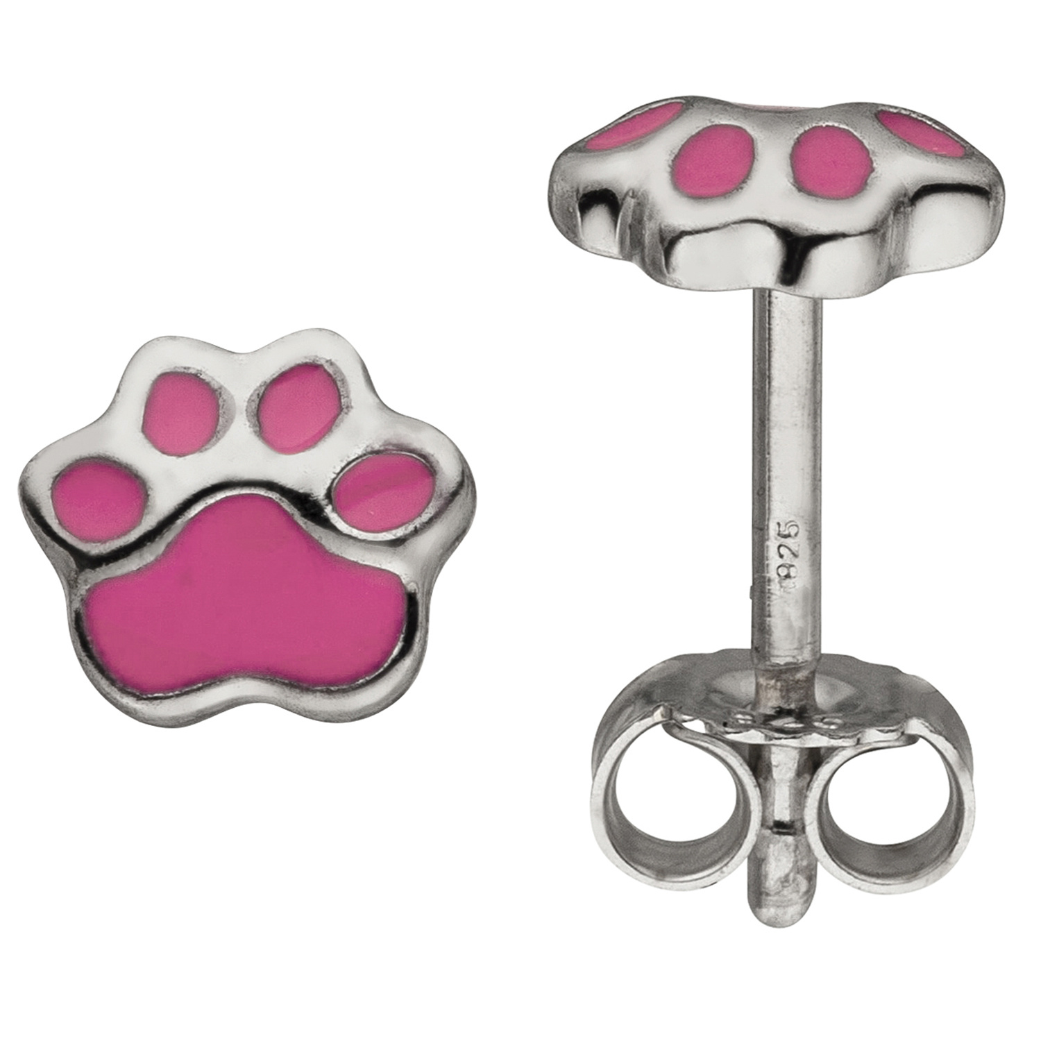 1 Paar Ohrstecker "Pfote" aus 925 Sterlingsilber, rhodiniert, mit pinkfarbenen Lackeinlagen,